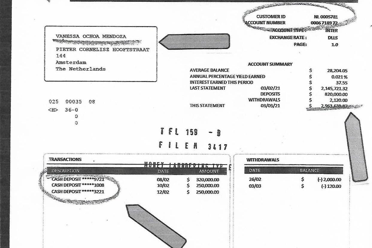 El hallazgo principal fue una cuenta bancaria en el banco ABN AMRO de Ámsterdam, Países Bajos, a nombre de Ochoa Mendoza, con más de cinco millones de dólares, cantidad que fue detectada como parte de los flujos financieros sospechosos durante la operación internacional contra el narcotráfico.